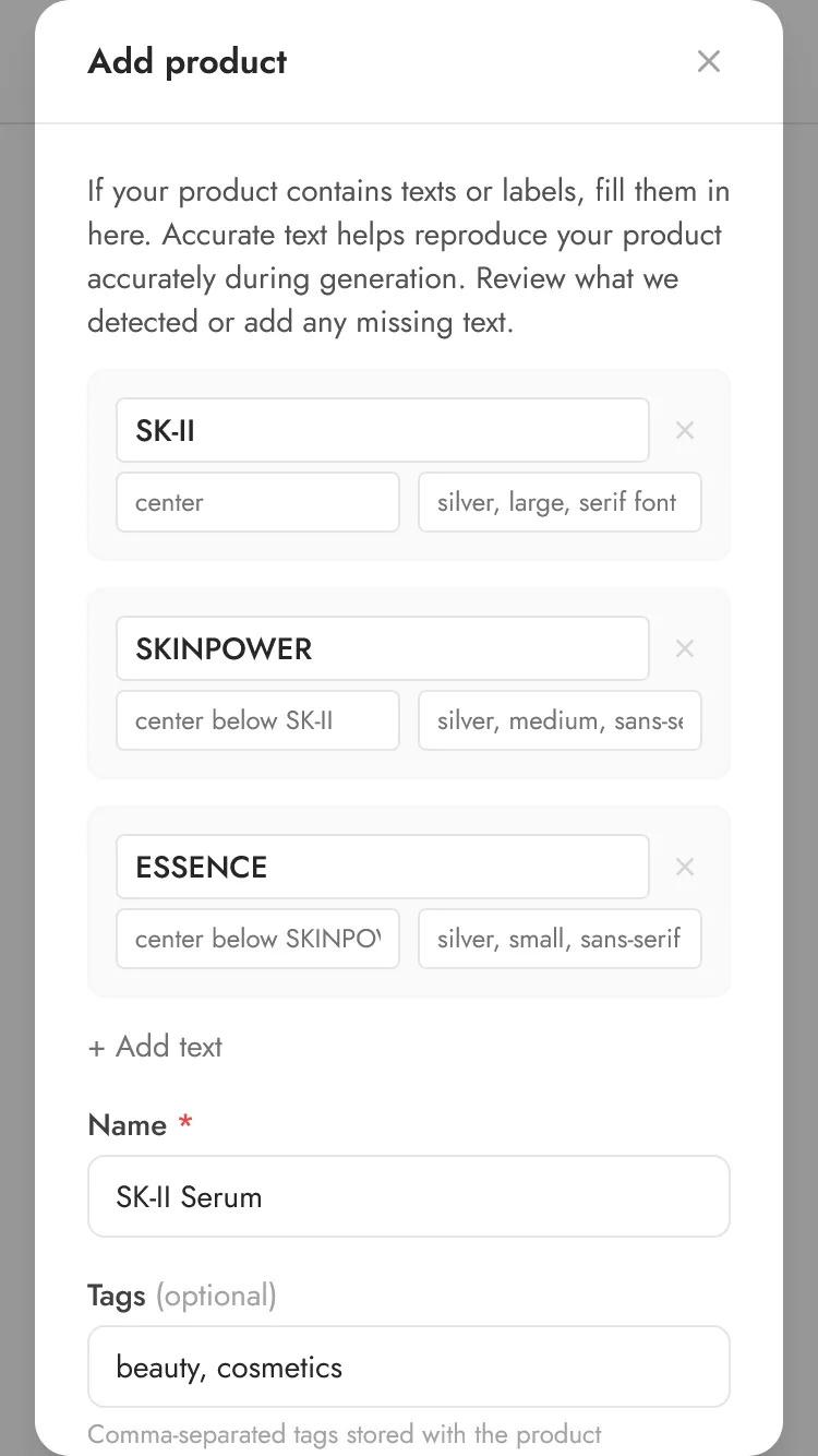 This text is then used during generation so your product photos preserve the correct labels and packaging copy. For best results, ensure the extracted text, if any, is accurate.