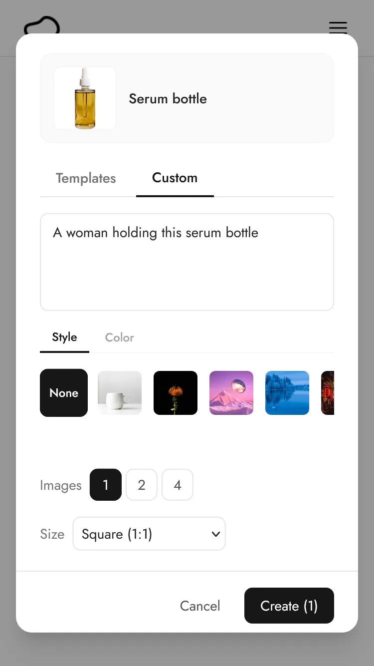 If you want something more specific, you can click on Custom to describe what you want, e.g. "A woman holding this serum bottle". You can also pick a specific style image or color that will influence the resulting image.