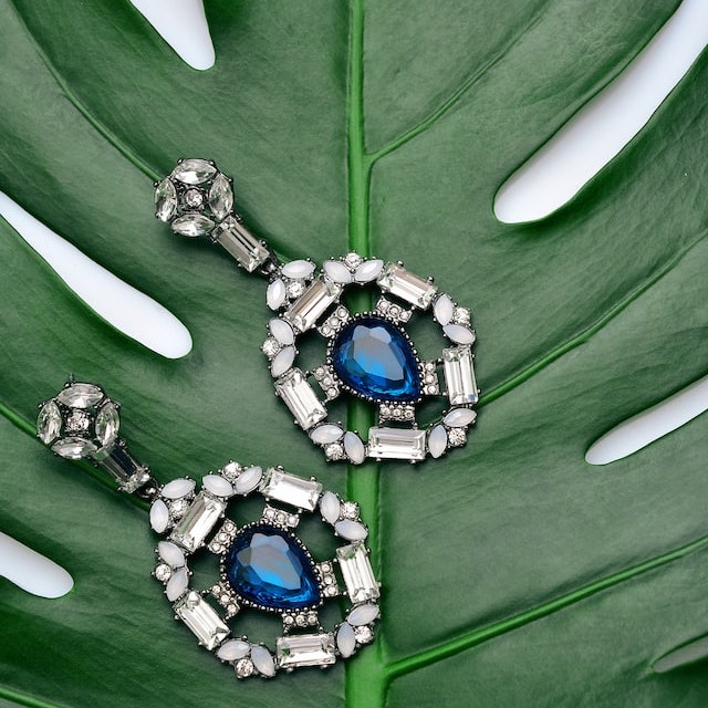 Monstera leaves feel luxurious and add an interesting color contrast to the blue sapphire.