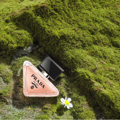 Prada Paradoxe's key notes, neroli, amber, and musk, arranged in its iconic triangular shape.